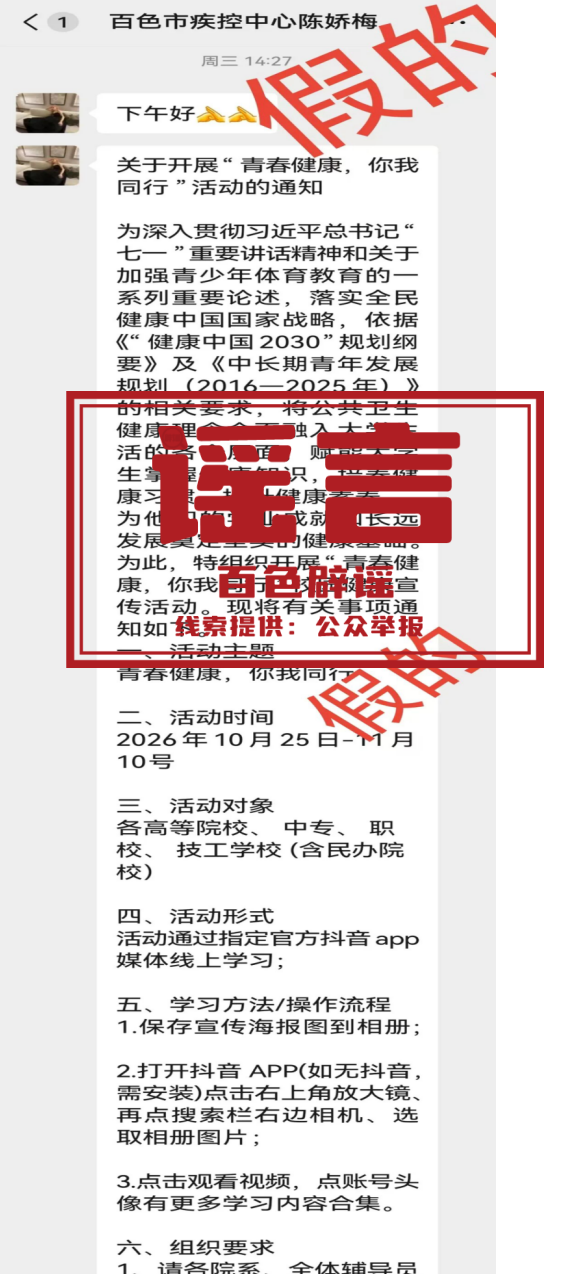 近日,百色市疾病預防控制中心接到多所學校及家長反饋,有自稱“百色市疾控中心陳嬌梅”的人員通過微信等渠道,以工作對接為名,要求添加好友,并散布關于開展“青春健康,你我同行”活動的不實通知,試圖進入校園開展活動。對此,市疾控中心發布辟謠聲明。